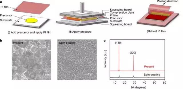 北京時間2017年9月7日,Nature在線發表了一篇上海交通大學韓禮元教授和楊旭東特別研究員(共同通訊)等人以題為“A solvent- and vacuum-free route to large-area perovskite films for efficient solar modules”的文章,該團隊研發出一種無溶劑、非真空的新沉積方案用于甲基銨鹵化鉛鈣鈦礦薄膜。它依賴于胺絡合物前體到鈣鈦礦膜的快速轉化,并隨后施加壓力。使用這種方式沉積的鈣鈦礦薄膜沒有針孔而且高度均勻。更重要的是,新的沉積方法可以在低溫環境中進行,有利于大面積鈣鈦礦裝置的制造。
