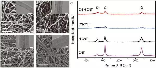 (a)CNTs (b)H- CNTs (c)CN- CNTs (d)CN-H- CNTs的SEM圖,其比例尺為500 nm;插圖為相應的TEM圖,其比例尺為10 nm。