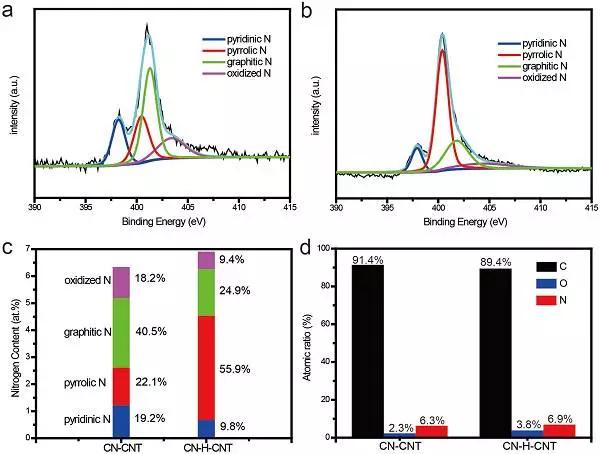 圖3. CN-CNTs和CN-H-CNTs的XPS及不同摻雜類型的氮原子所占比例