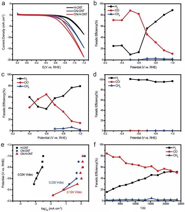 (b) CN-H-CNTs (c) CN-CNTs (d) H-CNTs在電催化過程中生成CO、H2、CH4的法拉第效率。