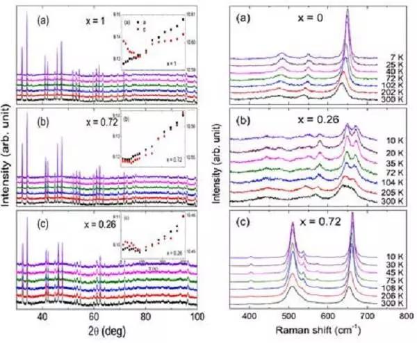 在本工作中,研究人員發現,和母體Ca3CoMnO6相比,沿著自旋鏈的方向(即c方向),電極化的量級和轉變溫度都提高了數倍。此外,當磁場垂直于鏈時探測到了電極化。這是在Ca3Co2-xMnxO6體系中第一次從實驗上探測到垂直于c方向的電極化。通過低溫XRD,對其低溫的結構進行了詳細研究,發現Co2+O6三棱鏡結構發生了Jahn-Teller畸變。對于x=1的母體樣品,其晶胞在兩個方向的變化是相等的,而對于x=0.75和0.25的樣品,在各個方向上發生了不對稱的變化。通過低溫Raman光譜,研究人員對聲子的振動模式進行了研究,發現Jahn-Teller畸變破壞了Co2+O6三棱鏡結構的C3對稱性,從而導致了沿著和垂直c軸方向的電極化。通過結構和聲子模式的研究表明,Ca3Co2-xMnxO6中鐵電性的形成的原因可能和晶格的Jahn-Teller畸變有關