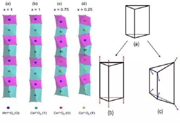 圖2 Ca3Co2-xMnxO6中晶格的結構的Jahn-Teller畸變和Raman振動模式的改變