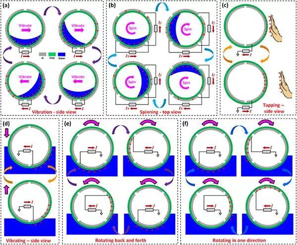 (f) 球形水基摩擦納米發電機在水表面朝一個方向滾動的工作原理。
