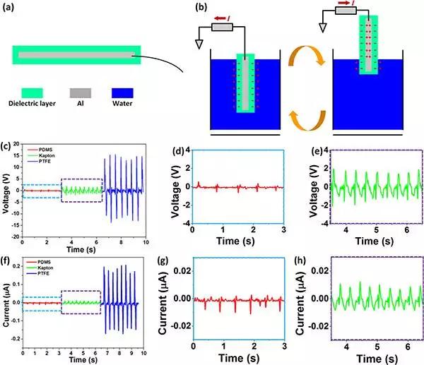 (h) 球形水基摩擦納米發電機振動時,內部電極產生的電流;