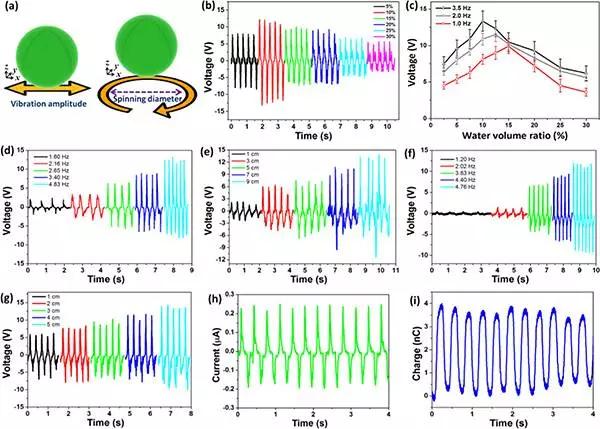 圖4. 球形水基摩擦納米發電機的優化和器件特性