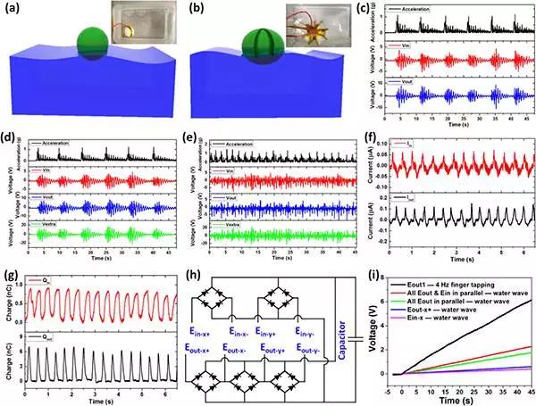 (h) 球形水基摩擦納米發電機的多個輸出通道經并聯整流后給電容充電;