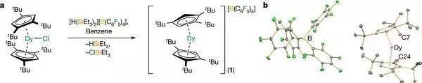 曼徹斯特大學Nicholas F. Chilton和 David P. Mills(共同通訊作者)等人報道合成了一種新的復合物[Dy(Cpttt)2][B(C6F5)4], (Cpttt = {C5H2tBu3-1,2,4}, tBu = C(CH3)3),能實現在22 Oe/s磁場掃速下,高達60 K的溫度下出現磁滯現象。并通過研究該溫度下樣品的動力學特征,表明磁滯現象源于局部金屬-配合基的振動模式。計算自旋動力學表明高溫下磁性弛豫源于局部的分子振動。這些實驗結果進一步證明,經過精確的分子設計,高于液氮溫度下在單分子上實現磁數據存儲是可實現的。