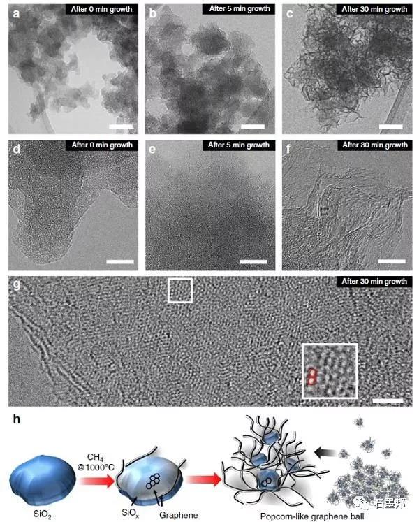 h) 爆米花狀石墨烯的生長示意圖。