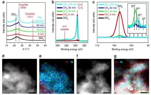 c) XPS中Si 2p峰; 在SiO2上生長石墨烯d)-e)5min和f)-g)30min之后,C,O,Si的EDX圖。