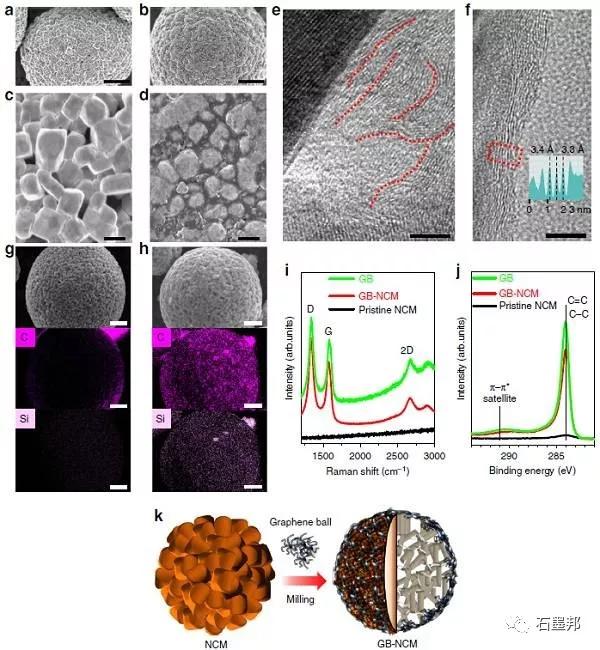 k) 石墨烯球包覆在LiNi6Co0.1Mn0.3O2上的示意圖。