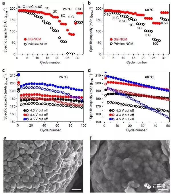 e)初始裝天下NCM和60℃4.3V截止電壓下100次循環(huán)的石墨烯球包覆NCM;