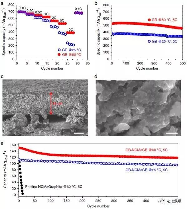 e) 石墨烯球-NCM/石墨烯球全電池在5C下25/60℃的長循環(huán)特性。