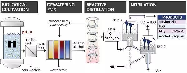 北京時間2017年12月8日,Science在線發表了美國可再生能源國家實驗室Gregg T. Beckham(通訊作者)團隊題為“Renewable acrylonitrile production”的文章,該團隊提出了一種使用3-羥基丙酸(3-HP)生產可再生ACN的新方法,所述3-羥基丙酸(3-HP)可由糖微生物產生。該方法通過用廉價的二氧化鈦固體酸催化劑脫水和氨氮化從3-羥基丙酸乙酯(乙基3-HP)獲得超過90%的ACN摩爾收率。隨后,該團隊進一步闡釋了一個基于這種化學反應的大規模集成工藝,可以實現丙烯酸乙酯近乎定量的ACN產率(98±2%)。這種吸熱方法消除了反應過程中失控的危險,并且比標準丙烯氨氧化方法獲得更高的產率,既避免氰化氫作為副產品同時也提高了工藝安全性并減少了產品處理要求。