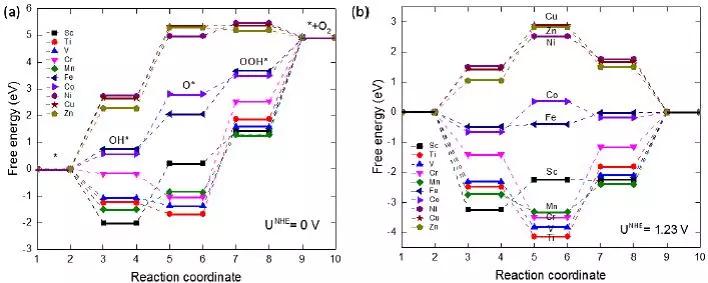 圖5 過渡金屬-COFs在OER中的自由能圖:電勢為0V(a)和1.23V(b).
