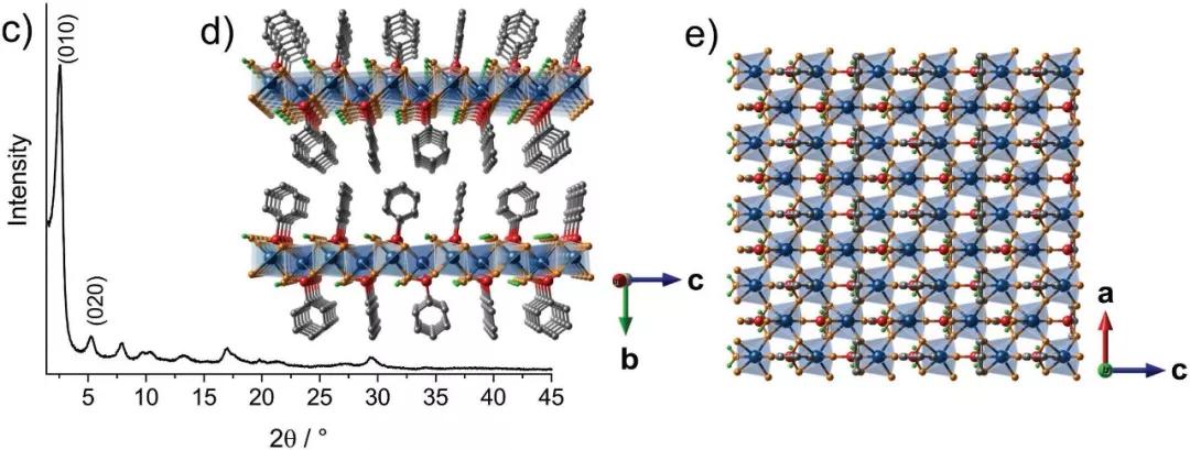 圖7 層狀鎳鐵有機膦酸鹽的XRD及結構(鎳/鐵-藍色,磷-紅色,氧-橙色,碳-灰色)