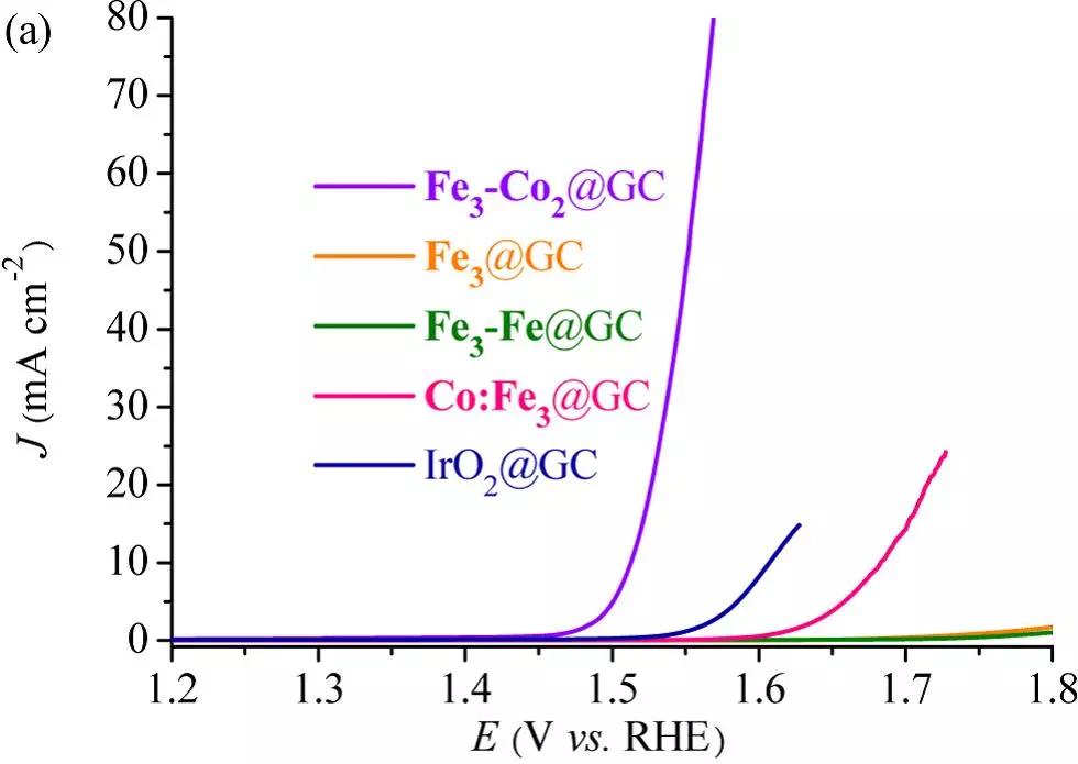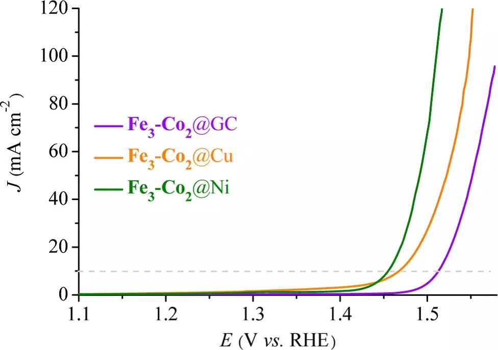 圖2顯示了在pH=13溶液中的電化學測試結果。作者選用了3種導電基底:玻碳(GC),泡沫銅(Cu)和泡沫鎳(Ni)用于測試,負載在不同導電基底的電極的活性表現出較大的差異:Fe3-Co2@GC,Fe3-Co2@Cu和Fe3-Co2@Ni的水氧化的起始電勢分別為1.46 V,1.43V和1.42V;在電流密度為10 mA cm-2下的過電勢分別為 283 mV,237 mV和225 mV;Tafel斜率分別為 43 mV dec-1,79mV dec-1,48 mV dec-1。可以看出,當使用泡沫鎳負載活性物質時催化活性最高,這是因為金屬鎳本身具有OER催化活性,而且三維結構的泡沫鎳具有比玻碳更大的比表面積。