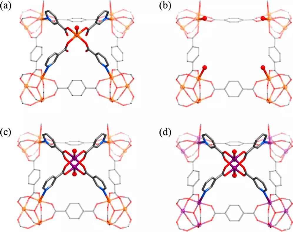 作者通過分步取代的方法,將槳輪型Co2-(RCOO)4(LT)2金屬簇固定于[{Fe3(μ3-O)(bdc)3}4]框架結構中形成Fe3-Co2 MOF,以提高鈷金屬簇的化學穩定性。圖1展示了合成Fe3-Co2 MOF的過程中參與的化合物和Co3-Co2 MOF的結構:首先,合成含有Fe(II)金屬簇的Fe3-Fe(圖1a);然后在酸性溶液中用小分子官能團替換Fe(II)金屬簇(圖1b);再用Co(II)金屬簇替換小分子官能團,得到Fe3-Co2 MOF結構(圖1c)。同時,作者合成了單一金屬的Co3-Co2 (圖1d)作為對比實驗。