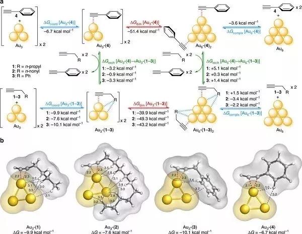 金在催化中的應用在過去的25年中經歷了巨大的發展,主要是由于其在溫和的反應條件下的高催化性能和在有機官能團轉化中的高選擇性。 根據金的氧化和聚集狀態,已經開發了不同類型的反應。 因此,Au(0)以小尺寸納米粒子(AuNPs)的形式用于非均相催化活化C-X鍵(X = C,H,鹵素等),而Au(I)和Au(III)物質被廣泛用作活化烯烴和炔烴的均相催化劑,金催化劑的發展使得有機合成的活性和復雜性大大提高。近日,來自西班牙拉里奧哈大學的Gonzalo Jiménez-Osés和José M. López-de-Luzuriaga教授(共同通訊)團隊描述了通過烷基鏈或芳族基團附加到簡單的炔烴的反應性π鍵上的非常小的金亞納族(Au n , n < 10)的瞬態穩定。中長鏈脂肪族炔烴(1-己炔和1-二十烷)和苯乙炔相對于苯乙炔的布朗斯特無酸水合的優越性能被實驗證明,并在計算上進行研究。由量子力學計算和時間分辨發光實驗支持的色散Au ... C-H和/或Au ...π相互作用的協作網絡被認為是這種穩定的起源。