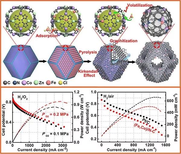 目前,報道的非貴金屬催化劑催化的ORR活性由于嚴重的浸出而在酸性介質中緩慢,表現為較大的超電位(40-400mV)和穩定性差于市售的Pt / C。為了實現商用Pt基材料的替代,中國科學技術大學吳宇恩教授和西安交通大學常春然副教授(共同通訊)團隊開發了一種主客體策略,構建了一種在N摻雜多孔碳上嵌入Fe-Co雙重位點的電催化劑,并展示了其在酸性電解質中氧還原反應的活性。該催化劑表現出優異的氧還原反應性能,具有與市售的Pt / C相當的起始電位(Eonset,1.06 vs 1.03V)和半波電位(E1 / 2,0.863 vs 0.858V)。燃料電池測試表明(Fe,Co)/ N-C比H2 / O2和H2 /空氣中報道的大多數無Pt催化劑優異。 此外,這種具有雙金屬位點的陰極催化劑在長期運行中是穩定的,電極測量為50,000次循環,H2 /空氣單室操作為100小時。 密度泛函理論計算揭示了雙重位點有利于O-O的激活,對四電子氧還原至關重要。