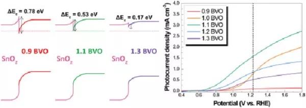 雖然BiVO4對于光驅動光電化學(PEC)水解是一種極具前景的光陽極,但是化學成分(Bi/V比例)的精確調控以及通過摻雜提升電學特性對于提升PEC性能是必要的。近日,來自韓國KAIST的Byungha Shin教授(通訊作者)團隊進行了基于不同Bi/V比例以及涉及不同Mo摻雜濃度的BVO復合物工程。通過物理和化學分析,研究人員發現BiVO4的材料特性以及它的PEC性能對化學組成及其敏感。研究人員優化的BiVO4基光陽極在最先進的SnO2/BiVO4異質結光陽極中展現出了最高的光電流——在相對于RHE下1.23V 產氧電流密度為2.62 mA cm−2和硫氧化電流密度為4.20 mA cm−2。 研究人員通過BiVO4的帶結構來解釋眾多不同組成成分的PEC性能,這項工作指出了為實現高效BiVO4基光陽極,對化學成分進行精細調控的重要性,對于未來制備其他高性能光電極的研究指明方向。