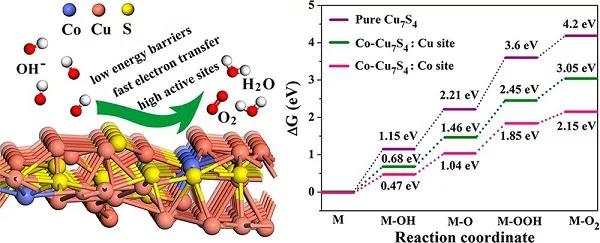 Cu基電催化劑在水氧化中很少有研究,雖然它們很廉價,但是因為它們極差的活性和穩定性。因此,開發有效的途徑來提升銅基電催化劑的活性對于其實際應用至關重要。通過金屬摻雜來改變電催化活性中心的電子結構繼而促進電子在催化活性位點和電極之間的傳輸是一種重要的方法來優化氫氣和氧氣的脫附能,進而提升固有電催化活性。來自蘇州大學的王顯福副教授和晏成林教授(共同通訊)等人通過鈷摻雜Cu7S4納米盤得到了高效的OER催化劑。DFT表明鈷摻雜Cu7S4能夠加速電子在鈷和銅之間傳輸,進而降低中間體和產物在OER過程中的能量勢壘。正如所期待的,該體系展現出了在10 mA cm−2的電流密度下過電位只有270 mV 。
