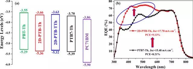 圖2.(a)聚合物以及受體材料PC71BM的能級圖(b)聚合物所對應的器件的EQE的變化