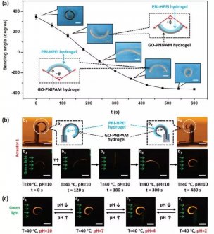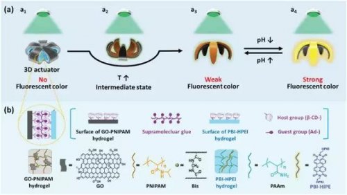 研究人員通過宏觀超分子組裝將收縮狀態的熱響應氧化石墨烯-聚(N-異丙基丙烯酰胺)(GO-PNIPAM)水凝膠層與pH敏感的苝二酰亞胺官能化超支化聚乙烯亞胺(PBI-HPEI)水凝膠層組合,從而得到雙層水凝膠;而通過這種雙層水凝膠,研究人員最終得到了三維水凝膠驅動器。該研究首次實現了智能水凝膠材料的復雜驅動和變色雙功能的協同,在軟體微型機器人、智能開關等智能仿生領域擁有巨大的潛在應用價值,研究人員的這項工作將極大地促進新型仿生智能材料的設計和制造。