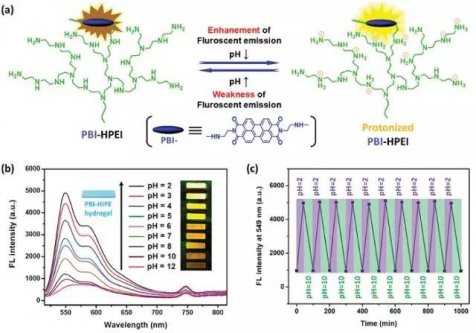 a)PBI-HPEI水凝膠的pH響應熒光變色原理;