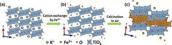 在堿性條件下,基于儲量豐富的鐵、鈷、鎳基催化劑可有效、穩定的催化OER。然而,上述催化劑在酸性條件下穩定性差并迅速被腐蝕。貴金屬氧化物催化劑(如RuO2和IrO2)兼具活性和良好的穩定性,能在酸性條件下進行催化,但其高成本和儲量短缺阻礙了其大規模應用。因此,亟待發現能夠在酸性電解質中穩定地作為全分解水OER電催化劑的金屬基材料。具有層狀結構的鈦酸鹽(如K2Ti4O9)已廣泛應用于離子插層和電池,易于與過渡金屬離子(如Co2+、Ni2+和Fe3+)發生離子交換反應。將鐵、鈷、鎳基催化劑與鈦酸鹽進行整合或將起到意想不到的效果。