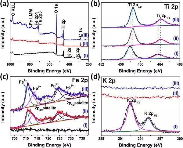 a) K2Ti4O9/Ti (I)、FexTi4O9/Ti (II)和Fe-TiOx LNWs/Ti (III)的XPS總譜;