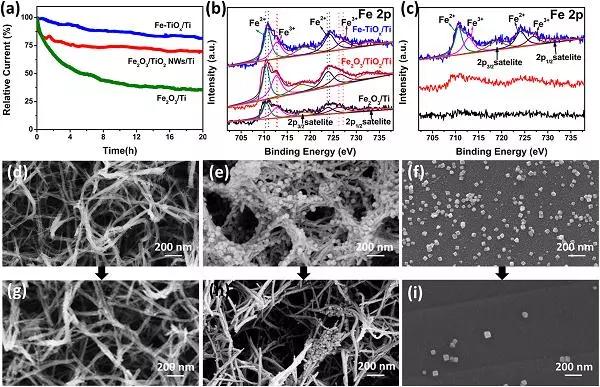 f,i) 穩定性測試前后Fe2O3/Ti的SEM圖像。