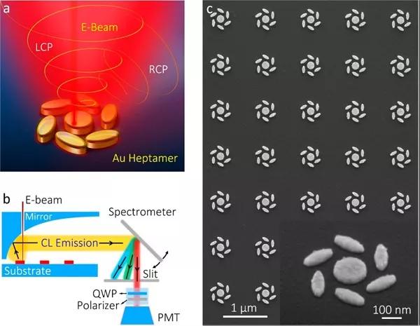 自然界中,手性結(jié)構(gòu)通常具有微弱的旋光響應(yīng);而得益于局域表面等離激元(LSP)共振,等離激元手性納米結(jié)構(gòu)和超材料可以獲得較強的手性光學(xué)響應(yīng)。在電子束激發(fā)下,金屬納米結(jié)構(gòu)同樣可以產(chǎn)生LSP,且產(chǎn)生陰極熒光 (CL) 與電子束激發(fā)位置有關(guān)。圓偏振光對現(xiàn)代物理研究至關(guān)重要,表面等離激元的CL已經(jīng)被證實可以包含旋性信息。然而,在量子通信、手性分子探測等當(dāng)代物理前沿領(lǐng)域,高度集成的納米光學(xué)器件需要更進(jìn)一步對光的旋性進(jìn)行亞納米尺度的調(diào)控。