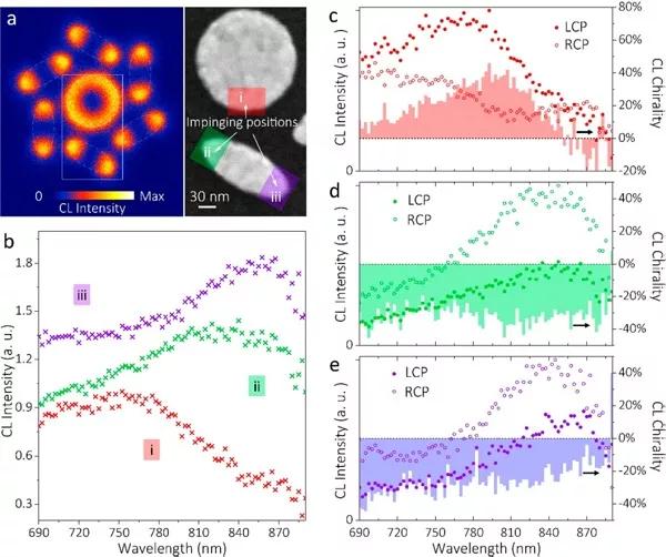 (c-e)3個探測位置的圓偏振CL譜(690~890nm)及CL 手性(CL chirality,柱狀圖)。