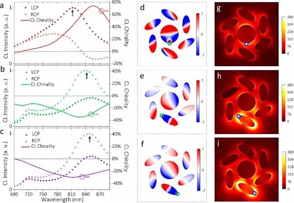 (a-c)對應(yīng)圖2中三個激發(fā)位置的圓偏振CL譜及CL手性模擬;
