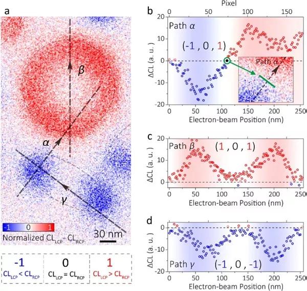 近日,北京大學(xué)方哲宇課題組在Nano Lett.發(fā)表了題為“Reveal and Control of Chiral Cathodoluminescence at Subnanoscale”的研究論文,報道了手性CL調(diào)控的最新研究成果。研究團(tuán)隊在SEM-CL探測平臺上,通過電子束激發(fā)單一的七聚體金納米結(jié)構(gòu)實現(xiàn)了可調(diào)控的CL發(fā)射。同時發(fā)現(xiàn)出射CL的旋性對電子-金屬相互作用位置十分敏感,因此可以通過電子束亞納米尺度的移動實現(xiàn)對CL旋性的調(diào)控。進(jìn)而通過設(shè)計電子束的掃描路徑,利用該技術(shù)手段在納米尺度實現(xiàn)了三進(jìn)制編碼輸出。