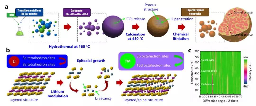 除去在粘合劑方面改善材料性能外,采用特殊氣體對富鋰錳基材料進行處理也是一種簡單易行的方法。以色列的Bar-IIan University和Tel-Aviv University以及美國的Stony Brook University[2]進行合作采用NH3在400℃對電極材料進行處理,發現經過NH3處理1-2h的材料,電化學性能得到了明顯的改善,并且發現在材料的表面發生了一系列的氣-固反應 :Co和Mn的含量減小;結構重排,降低了Co-O, Mn-O鍵的配位數,并且在材料的表面形成了類尖晶石結構;Li+從材料的本體中脫出,在材料的表面形成了LiOH, Li2CO3, and Li2O.這些結構以及表面的改變深刻的影響了材料的性能。(圖2)