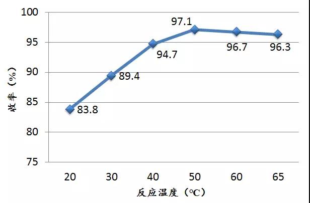 圖中可以看出,隨著溫度的升高,對甲氧基苯甲酸的收率不斷升高,當(dāng)溫度達(dá)到50℃左右時,收率達(dá)到最大值,隨著溫度的升高,原料有分解現(xiàn)象且產(chǎn)物雜質(zhì)增多,由此基本標(biāo)定該反應(yīng)在微通道反應(yīng)器中最佳反應(yīng)溫度為50℃左右。