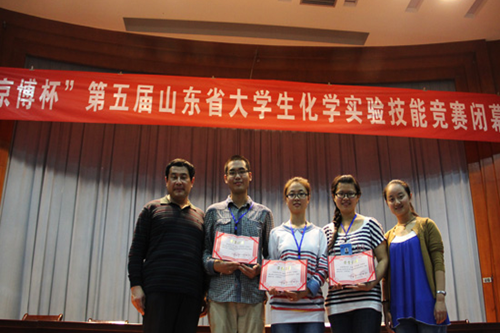 山東省大學生化學實驗技能競賽從2009開始舉辦,每年一屆,參賽選手由大賽組委會在各參賽高校化學、化工相關專業學生中隨機抽取3人參加。競賽分為筆試和實驗操作兩部分。筆試兩小時,其內容涵蓋四大基礎實驗中的基本原理及實驗室基本規則,主要檢驗學生對實驗基本理論掌握的程度;實驗操作8小時,基本內容包括無機化學實驗、分析化學實驗、有機化學實驗、物理化學實驗中的基本操作及實驗設計內容,主要考察學生分析問題解決問題的能力,實驗分為三個組,各組實驗難易程度相當。