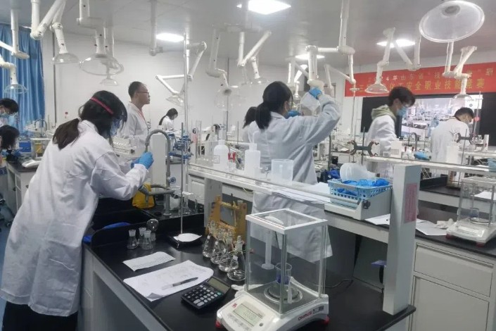 11月28-30日,有機合成工賽道在淄博市技師學(xué)院開賽。賽道設(shè)職工(教師)組和學(xué)生組兩個組別,共有來自相關(guān)院校和化工企業(yè)的三十余支代表隊參賽。比賽內(nèi)容包括專業(yè)理論知識、仿真操作、技能操作3個模塊。理論知識考核包括職業(yè)衛(wèi)生健康、化工環(huán)保安全、個人安全防護、法律法規(guī)、職業(yè)道德及守則、應(yīng)急救援處置、有機合成技術(shù)專業(yè)知識等內(nèi)容;仿真操作考核包括生產(chǎn)準(zhǔn)備、生產(chǎn)操作、故障判斷與處理、設(shè)備維護與保養(yǎng)等內(nèi)容;技能操作考核包括化學(xué)分析和有機合成兩部分。