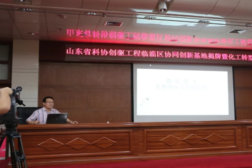 7月31日上午,山東省科協(xié)創(chuàng)驅(qū)工程臨淄區(qū)協(xié)同創(chuàng)新基地揭牌暨化工行業(yè)轉(zhuǎn)型升級(jí)對(duì)接會(huì)在臨淄區(qū)成功舉行。山東省科協(xié)副主席紀(jì)洪波同志到會(huì)致辭。大會(huì)由淄博市科協(xié)主席卞軍同志主持。