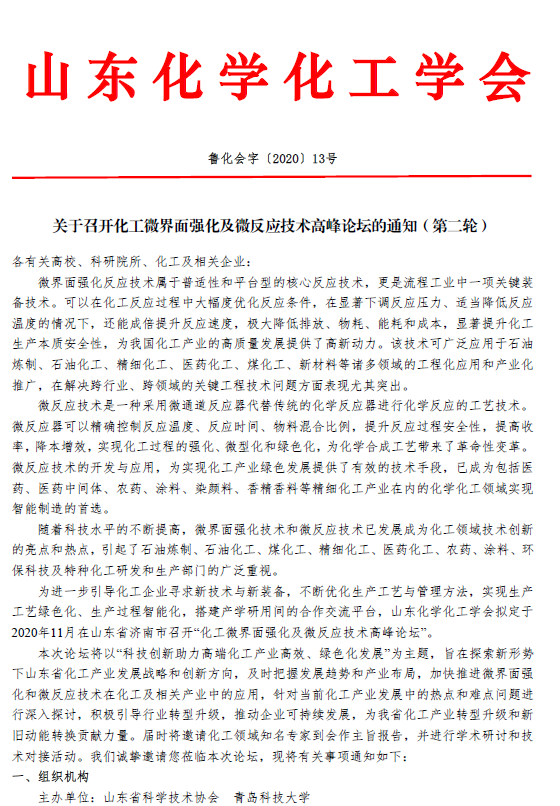 關于召開化工微界面強化及微反應技術高峰論壇的通知(第二輪)
