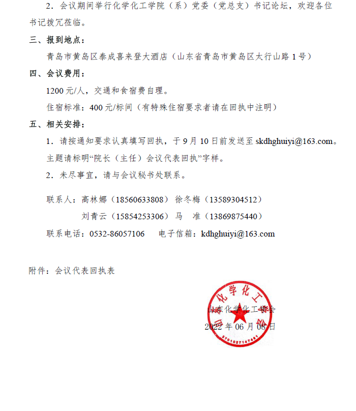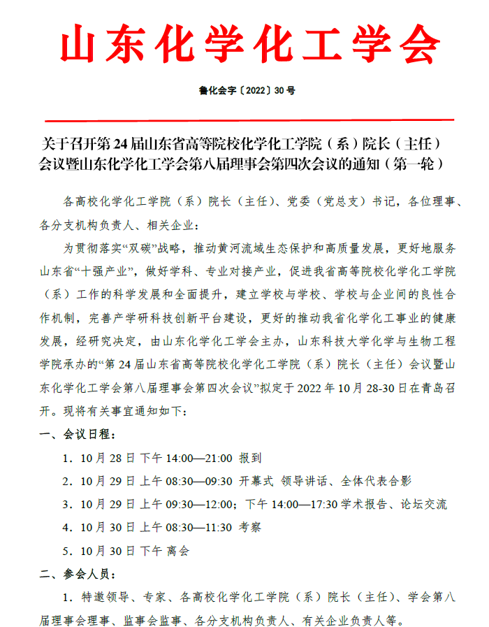 關(guān)于召開第24屆山東省高等院?;瘜W化工學院(系)院長(主任)會議暨山東化學化工學會第八屆理事會第四次會議的通知(第一輪)